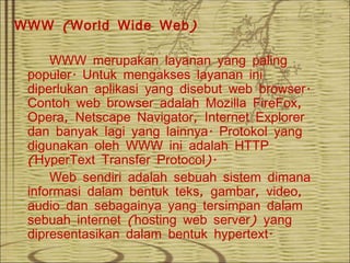 Dokumen ini membahas berbagai layanan internet, seperti WWW, email, FTP, newsgroup, milis, chatting, instant messaging, VoIP, streaming, dan interaksi elektronik. Setiap layanan dijelaskan dengan fungsi dan cara kerjanya, serta kelebihan dibandingkan metode tradisional. Layanan-layanan ini memungkinkan komunikasi, transfer data, dan interaksi yang lebih efisien dan cepat melalui internet.