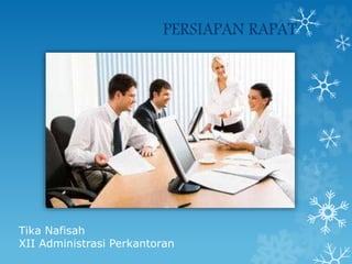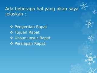 Dokumen ini membahas tentang persiapan rapat, termasuk pengertian, tujuan, dan unsur-unsur yang diperlukan. Rapat diselenggarakan untuk memecahkan masalah, menyampaikan informasi, serta meningkatkan partisipasi peserta. Persiapan mencakup penetapan tujuan, waktu, tempat, akomodasi, dan peralatan yang diperlukan.