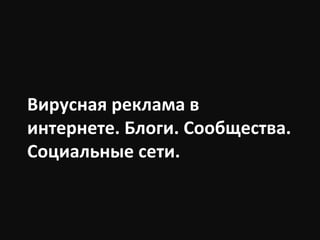 Документ посвящен вирусной рекламе в интернете, включая блоги, сообщества и социальные сети с акцентом на период 2007-2008 годов. Обсуждаются методы размещения информации в существующих группах и создание брендированных сообществ, а также будущее социальных сетей и сервисов, основанных на геолокации. Также затрагиваются темы развития мобильных социальных сетей и нишевых проектов.