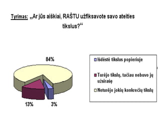 IV. Užsirašyk ! Kai rašome – užsimezga magiškas ryšys tarp rašiklio ir mūsų proto . Užrašyti tikslai visuomet turi didesnę tikimybę būti sėkmingai įgyvendinti. Markas Makormakas ( angl. Marc McCormack ) knygoje „Tai, ko neišmokstama Harvardo verslo universitete“ aprašo 1979-1989 m. atliktą tyrimą.