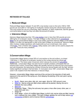 Tillage refers to agricultural practices that mechanically agitate soil, such as plowing, stirring, digging, and overturning. It is often classified into primary and secondary tillage based on depth and thoroughness. Primary tillage like plowing produces a rough surface, while secondary tillage creates a smoother seedbed. Tillage can have both positive effects, like aerating soil and destroying weeds, and negative effects, such as increased erosion and loss of nutrients. Modern no-till and conservation tillage methods are increasingly used as alternatives to minimize environmental impacts.
