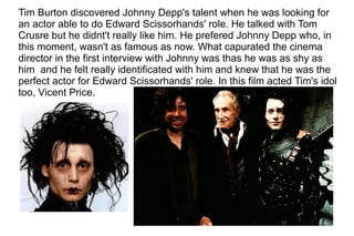 Johnny Depp and Tim Burton have collaborated on seven films since they met during the making of 'Edward Scissorhands.' Their successful partnership includes notable works such as 'Sleepy Hollow,' 'Charlie and the Chocolate Factory,' and 'Alice in Wonderland.' The document highlights the evolution of their relationship and the unique characters Depp portrayed in each film.