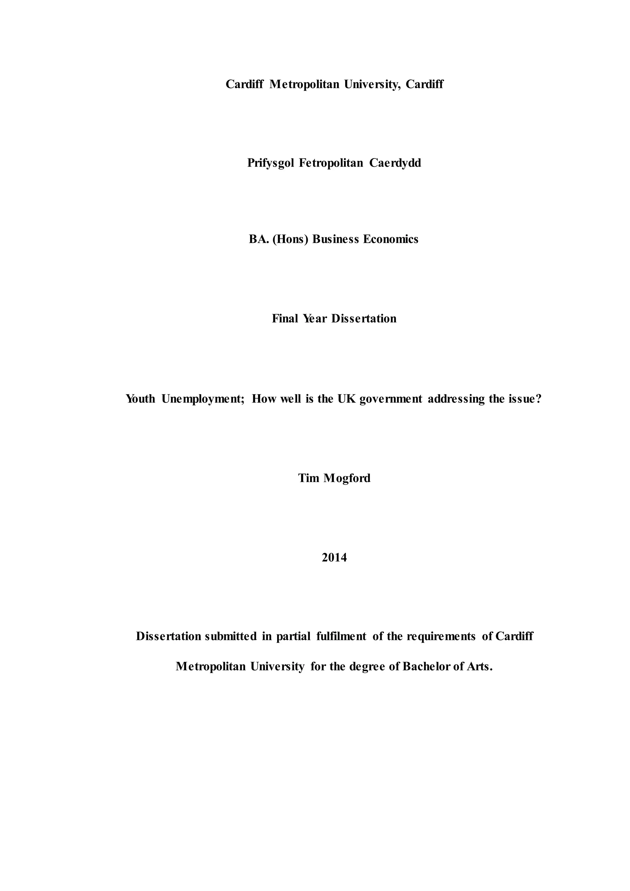 This document is a dissertation submitted by Tim Mogford in 2014 at Cardiff Metropolitan University in partial fulfillment of the requirements for a Bachelor of Arts degree in Business Economics. The dissertation investigates whether the UK government is adequately addressing the issue of youth unemployment. It includes an introduction outlining the research question and background on youth unemployment in the UK. The literature review defines key terms and examines previous research on the causes and costs of youth unemployment and policies implemented by the UK government. The methodology section outlines the primary and secondary data collection and analysis that will be used. Results and discussion will analyze the data and evaluate the effectiveness of government policies in addressing the causes of youth unemployment.