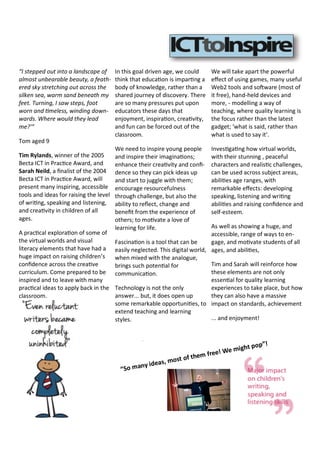 The document announces a two-day training event on October 6th and 7th, 2014 to be held at Long Sutton Primary School. Tim Rylands and Sarah Neild will present on ways to use technology to motivate and inspire students of all ages and abilities. On the first day, they will share many tools and ideas for raising writing, speaking, listening and creativity. The second day, Tim will lead classroom sessions with Key Stage 1 and 2 students, allowing teachers to observe techniques in action. Attendees can sign up for the full two days or just the first day of training.