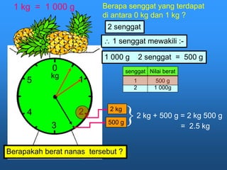 Dokumen menjelaskan tentang konsep senggat dalam mengukur berat benda dalam satuan kilogram dan gram. Sengkat mewakili interval berat antara 0-1000 gram yang dibagi menjadi 10 bagian yang masing-masing mewakili 100 gram. Beberapa soal ditanyakan untuk menghitung berat benda-benda seperti nanas, pisang, tembikai, anggur, mangga, dan tomato menggunakan konsep senggat.