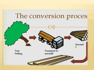 The document provides an overview of timber processing, covering the conversion, seasoning, deterioration, and preservation of wood. It details the processes of felling, sawing, and seasoning methods including natural and artificial techniques, as well as the factors affecting the quality and durability of timber. Additionally, it discusses the preservation of timber to prevent decay and describes the manufacturing of special timber products such as veneers and plywood.