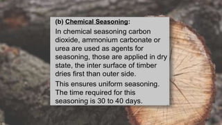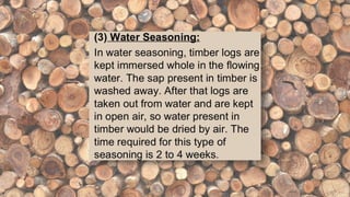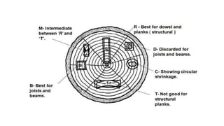 The document provides an extensive overview of timber, including its definition, uses in construction, properties, defects, seasoning methods, and preservation techniques. It discusses various classifications of timber, such as hardwood and plywood, as well as joinery techniques for wood construction. Additionally, it highlights the advantages of seasoned timber and types of commonly used timbers in India and Malaysia.