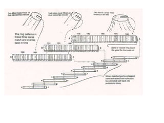 Timber can refer to worked wood or wood in its natural state. Dendrochronology is the scientific dating method using analysis of tree ring patterns. It allows archaeologists to date pieces of wood and structures to the year they were felled or constructed. However, it can be difficult to determine the exact age due to wood being reused or replaced.