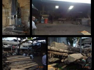 This document provides an overview of timber as a construction material. It begins with definitions of timber and discusses how trees are converted into usable wood. It then covers the various uses of timber in construction, including as forms for concrete, in scaffolding, and as a primary building material. The document discusses common timber species used in India and includes photos. It also examines the local market for timber, the workshop process, and cost comparisons. Finally, it details various defects that can occur in timber, grouping them by cause such as natural forces, fungi, insects, and the conversion process.