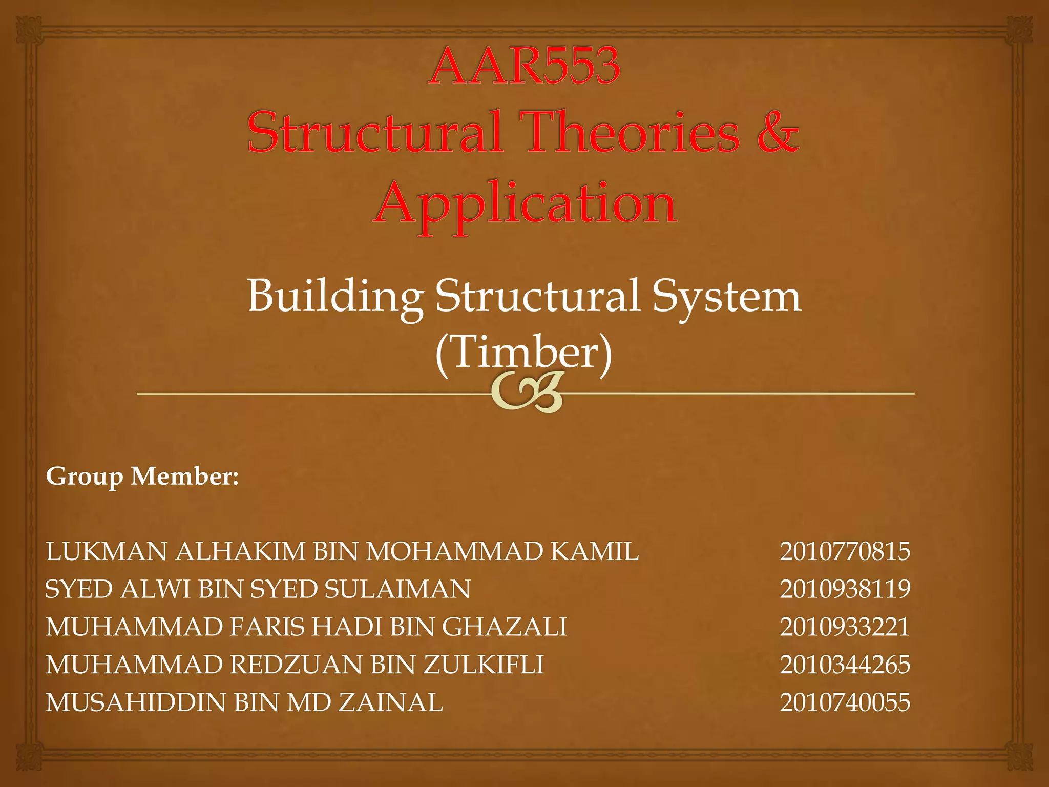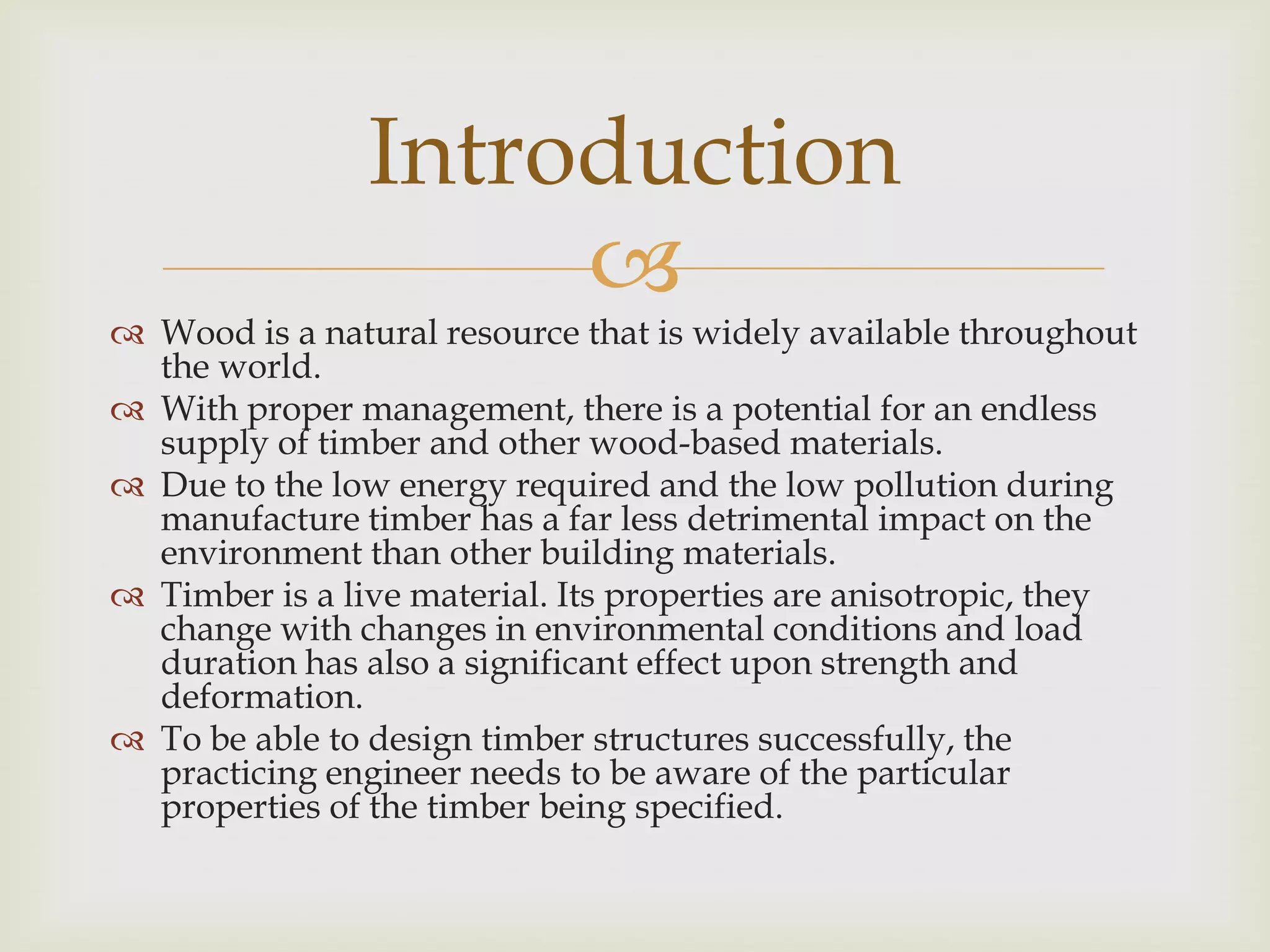 This document discusses timber as a structural building material. It notes that timber is a renewable resource with low environmental impact compared to other materials. Timber structures use vertical posts and horizontal beams. As a structure, timber can transmit and resist loads through axial compression and bending. Properties like stress, deflection and strength depend on factors like grain direction, load type and material properties. Timber combines well with other materials like steel and concrete in composite structures.