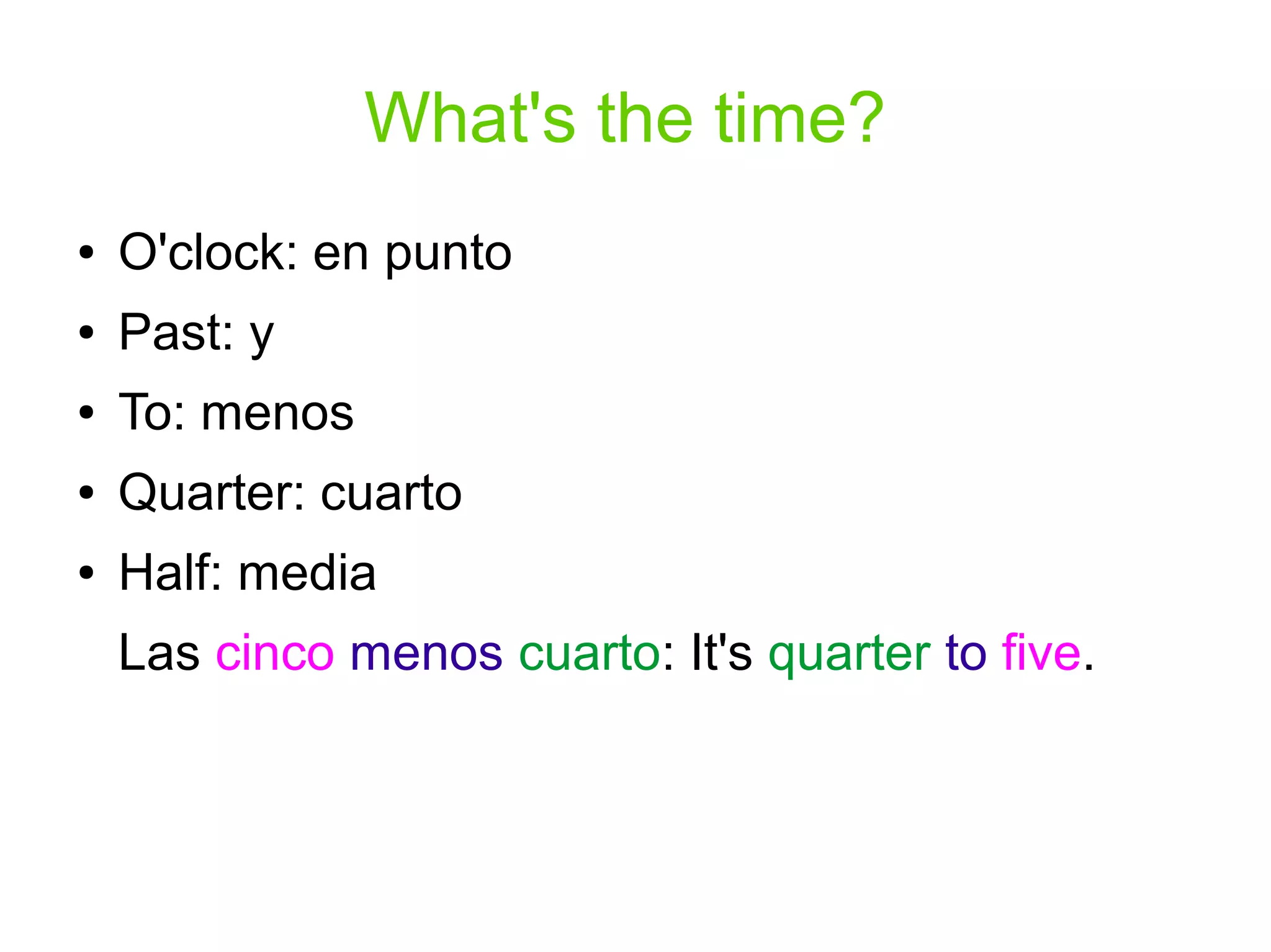 The document provides Spanish phrases and examples for telling time in Spanish. It lists the terms for o'clock, past, to, quarter, and half, and examples such as "Las cinco menos cuarto" meaning "It's quarter to five." It then gives examples of times like "It's one o'clock" and uses both Spanish phrases and digital times like "6:15" to show equivalent times in Spanish.