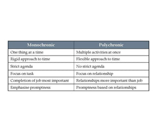 The document discusses different perspectives on time between various cultures. It notes that some cultures like Western cultures see time as rigid and structured, focusing on schedules and promptness, while other cultures see time as more flexible and focus more on relationships. The document also discusses personal experiences living in Sudan, where the author notes locals had a more relaxed attitude towards timelines and schedules compared to their own perspective, and discusses how their view of time changed by being immersed in the local culture.