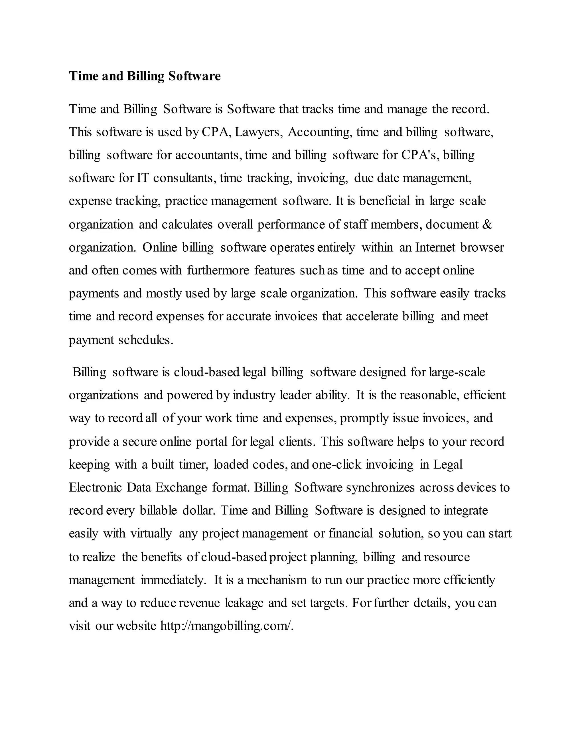 Time and billing software is designed to track time, manage records, and facilitate billing for professionals such as CPAs and lawyers, particularly in large organizations. It offers features like online payment acceptance, expense tracking, and integration with project management tools to enhance efficiency and reduce revenue leakage. The software supports secure online access for clients and allows for easy synchronization across devices.