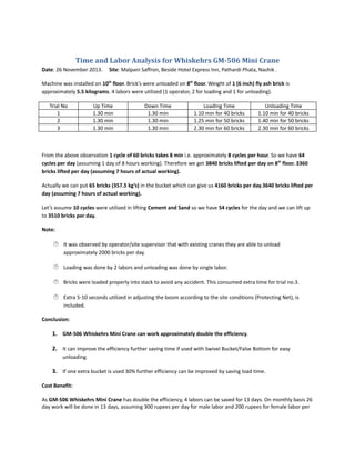 The document analyzes the time and labor efficiency of using a Whiskehrs GM-506 Mini Crane to unload bricks at a construction site over several trials. It found that the crane could unload approximately 64 cycles of 60 bricks per day, totaling 3,840 bricks lifted to the 8th floor daily. With 7 hours of actual working time, it could unload around 3,360 bricks per day. Using the crane's full bucket capacity of 65 bricks, it could potentially unload 4,160 bricks daily. Accounting for 10 cycles to lift cement and sand as well, the crane could unload around 3,510 bricks per day. Currently, site cranes can only unload about 2,000 bricks daily.