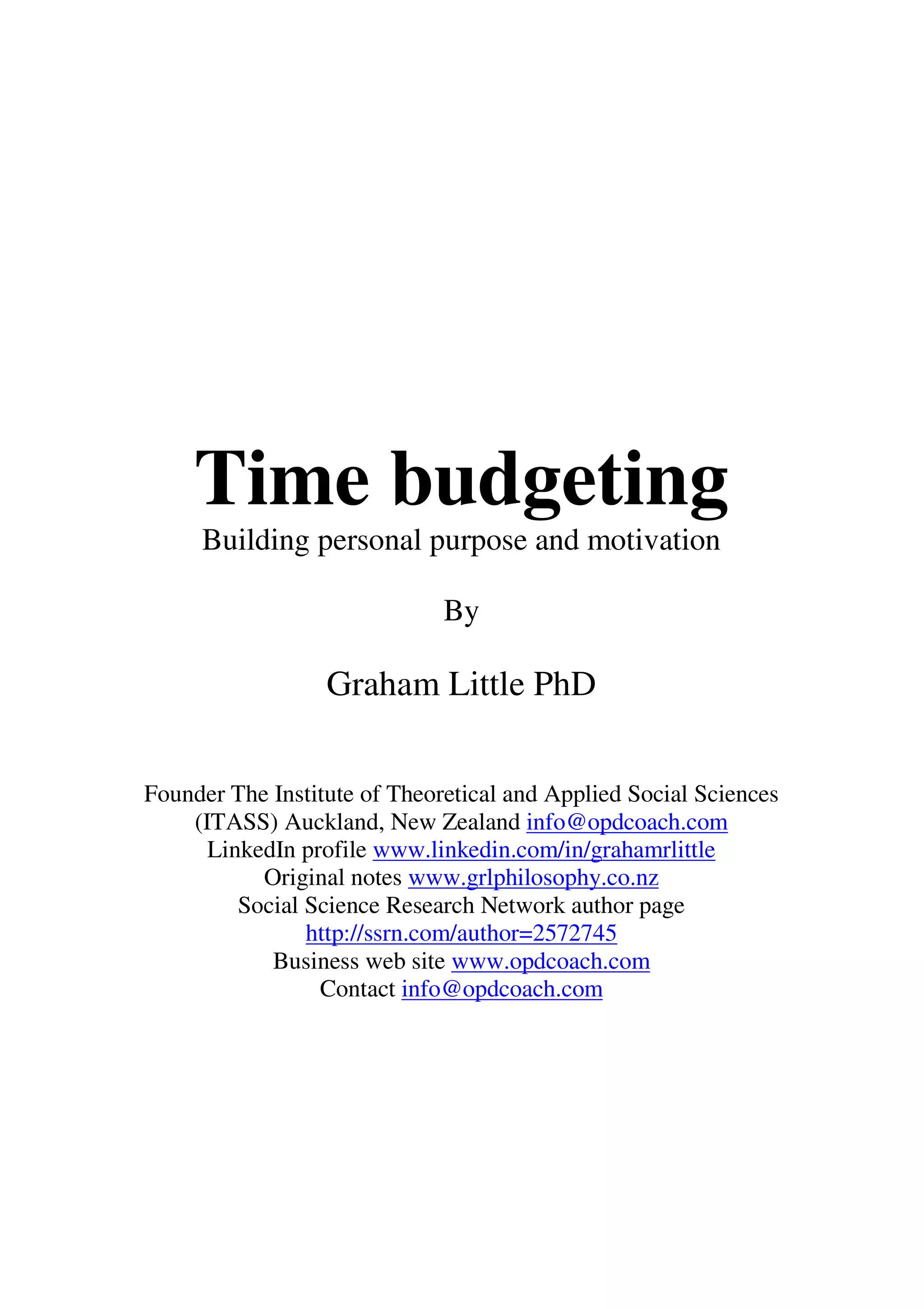 The document discusses time budgeting and how it is an important skill for everyone to learn in order to be successful. It describes a conversation between a Learning and Development Manager and a student where they discuss a time budgeting workshop that teaches people how to properly structure their days and stay on task. The workshop is designed to help prevent people from letting their days get away from them like the example of the manager who lost track of what they needed to accomplish.