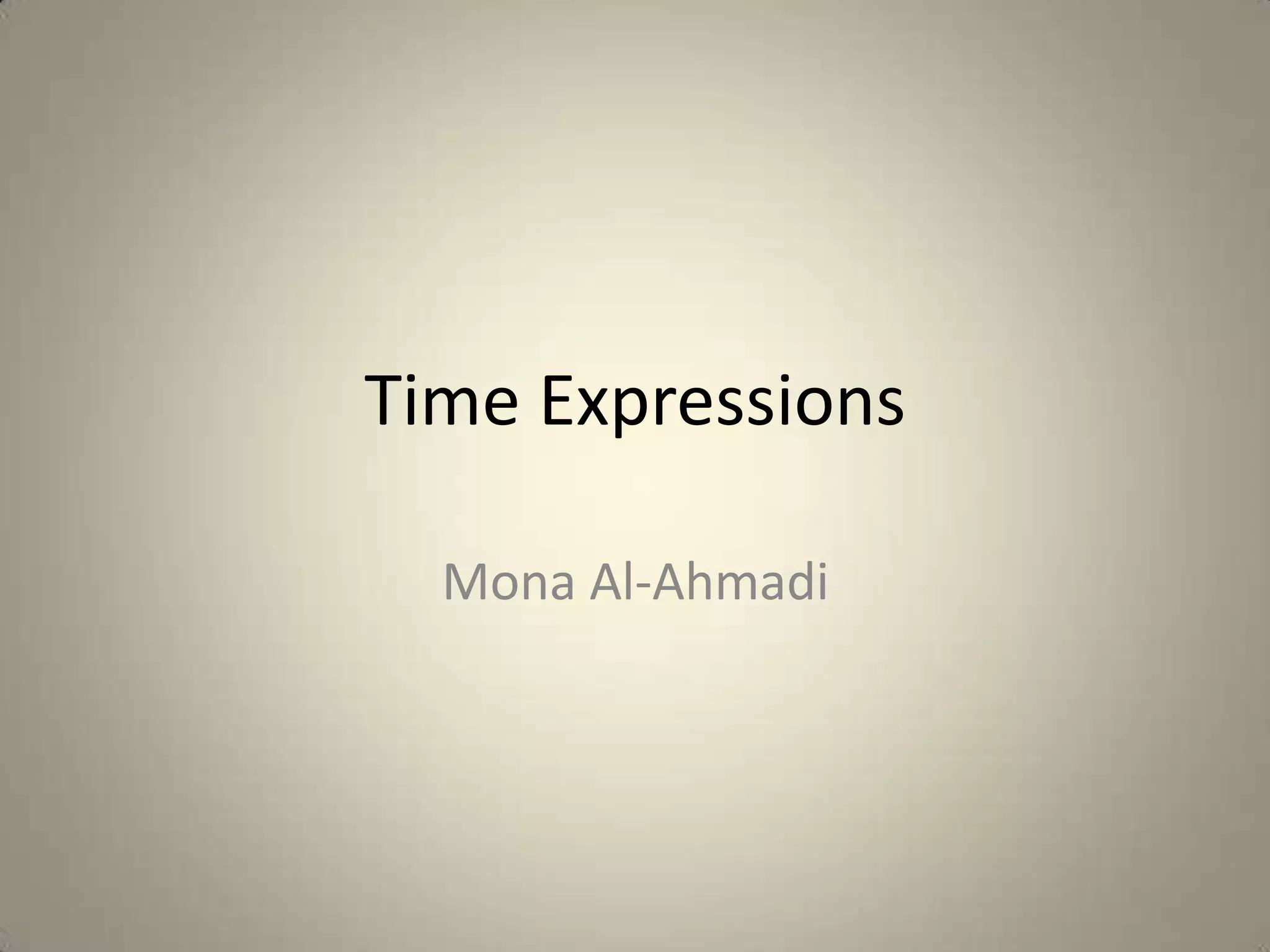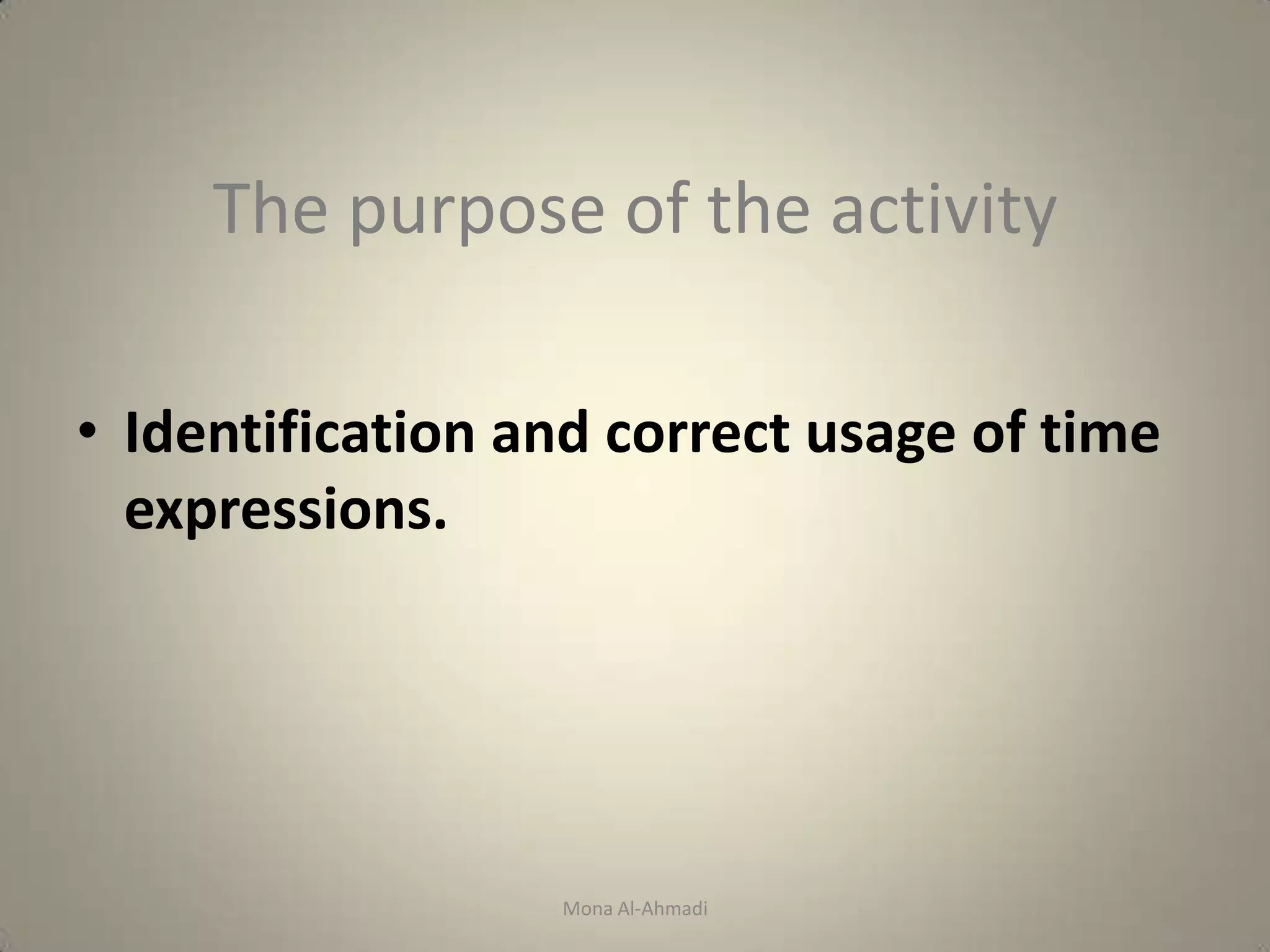 The document discusses time expressions and their usage with different tenses. It provides examples of time expressions used with the past simple and present perfect tenses. The purpose is to help students identify and correctly use time expressions. As part of the lesson, students will match time expressions to sentences in an exercise and work together in small groups to complete the activity.