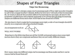 This document discusses promoting reflective inquiry in mathematics through developing "Habits of Mind" in students. It lists 12 habits of mind that mathematical thinkers should develop, such as understanding which tools are appropriate to solve problems, being flexible in thinking, and engaging in metacognition. It also lists the 8 Standards for Mathematical Practice from the Common Core State Standards. The document was then used in a math education class, where students worked through example problems to develop these habits of mind and presented problems to their peers for feedback.