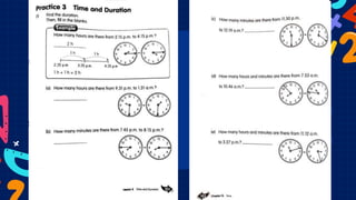 The document outlines a mathematics lesson focused on telling time using analogue clocks and finding durations between given times. It includes learning objectives such as converting minutes to hours, understanding 12-hour and 24-hour clock formats, and practical activities for students to record their daily routines. The lesson emphasizes the application of these concepts through virtual manipulatives and encourages students to submit their work online.