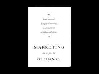The document calls for advertising agencies to take a more radical approach in three key areas: 1) Focus on outcomes rather than outputs and think beyond traditional advertising to solve clients' business problems, 2) Stop thinking about their work in a vacuum and better understand cultural trends, and 3) Break away from narcissism and putting themselves at the center to instead focus on understanding people's real interests. It advocates for smaller, more experimental ideas and a culture of continual learning and improvement.