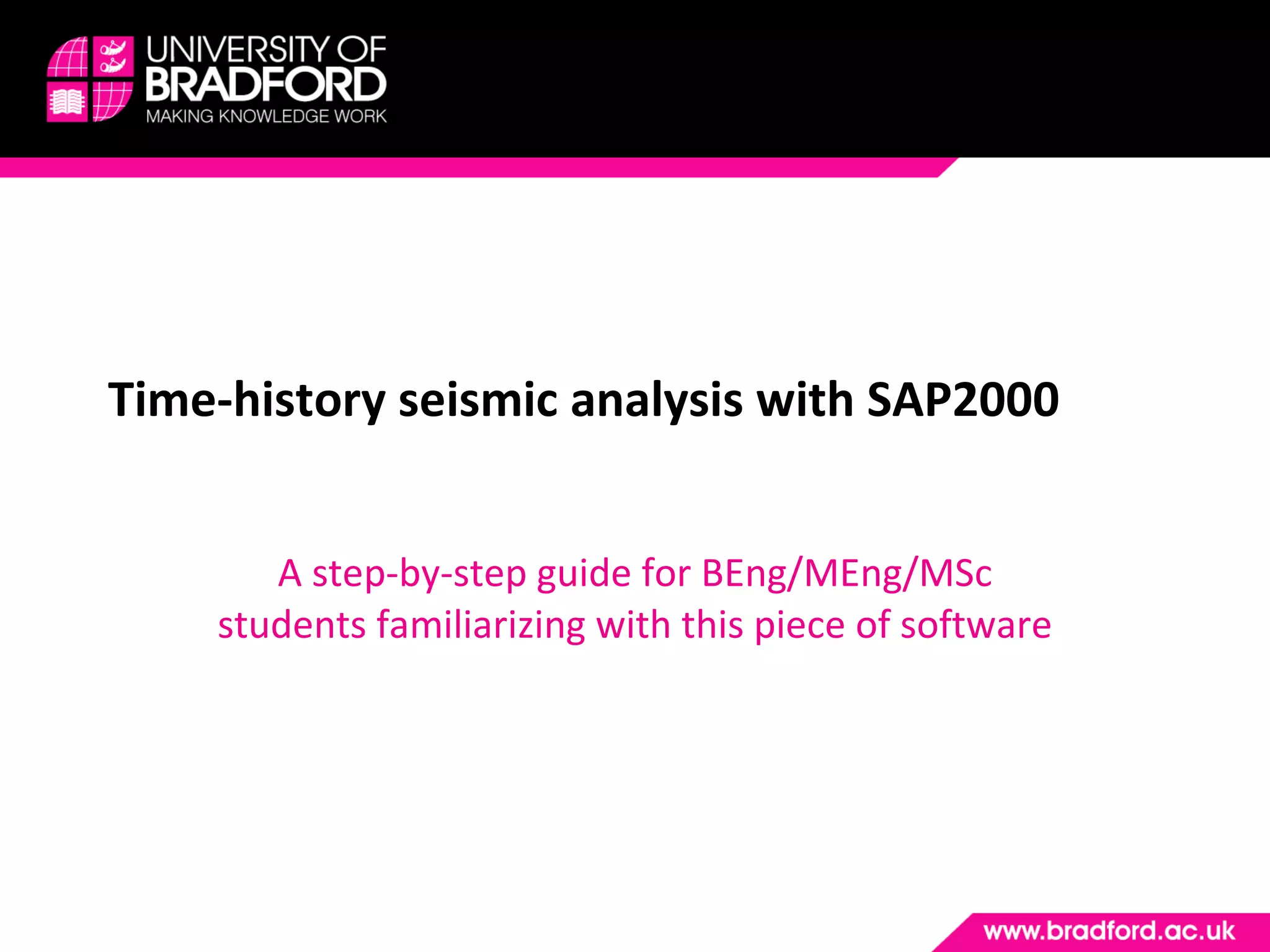 The document provides a step-by-step guide for conducting a time-history seismic analysis using SAP2000 software. It details how to: