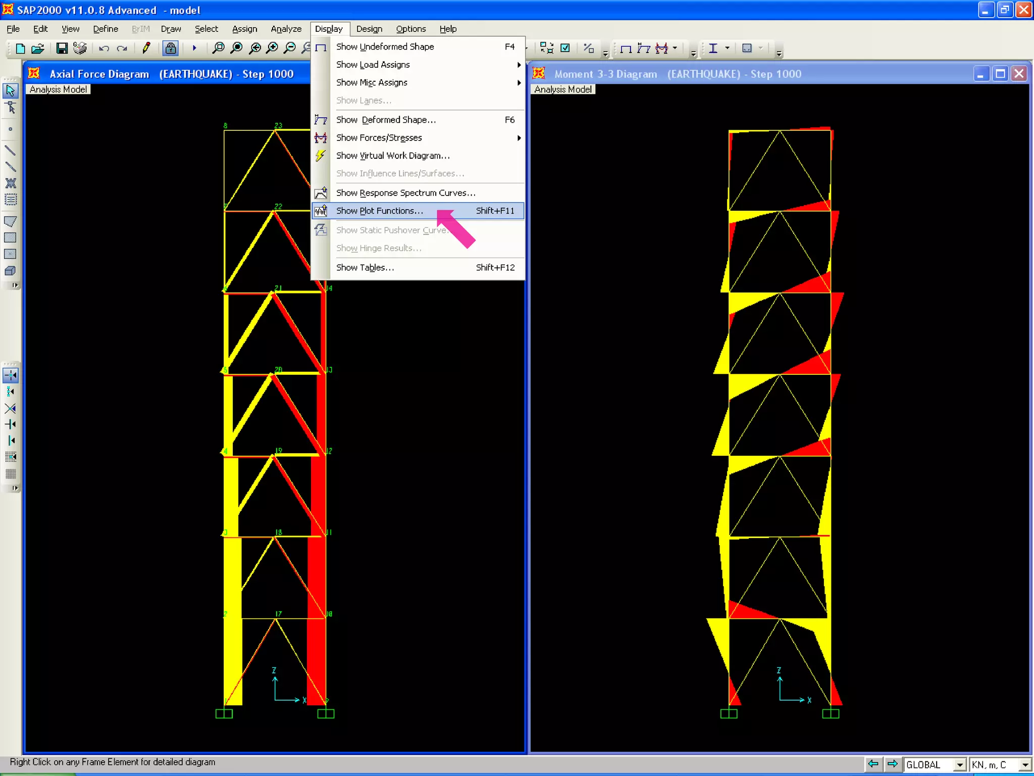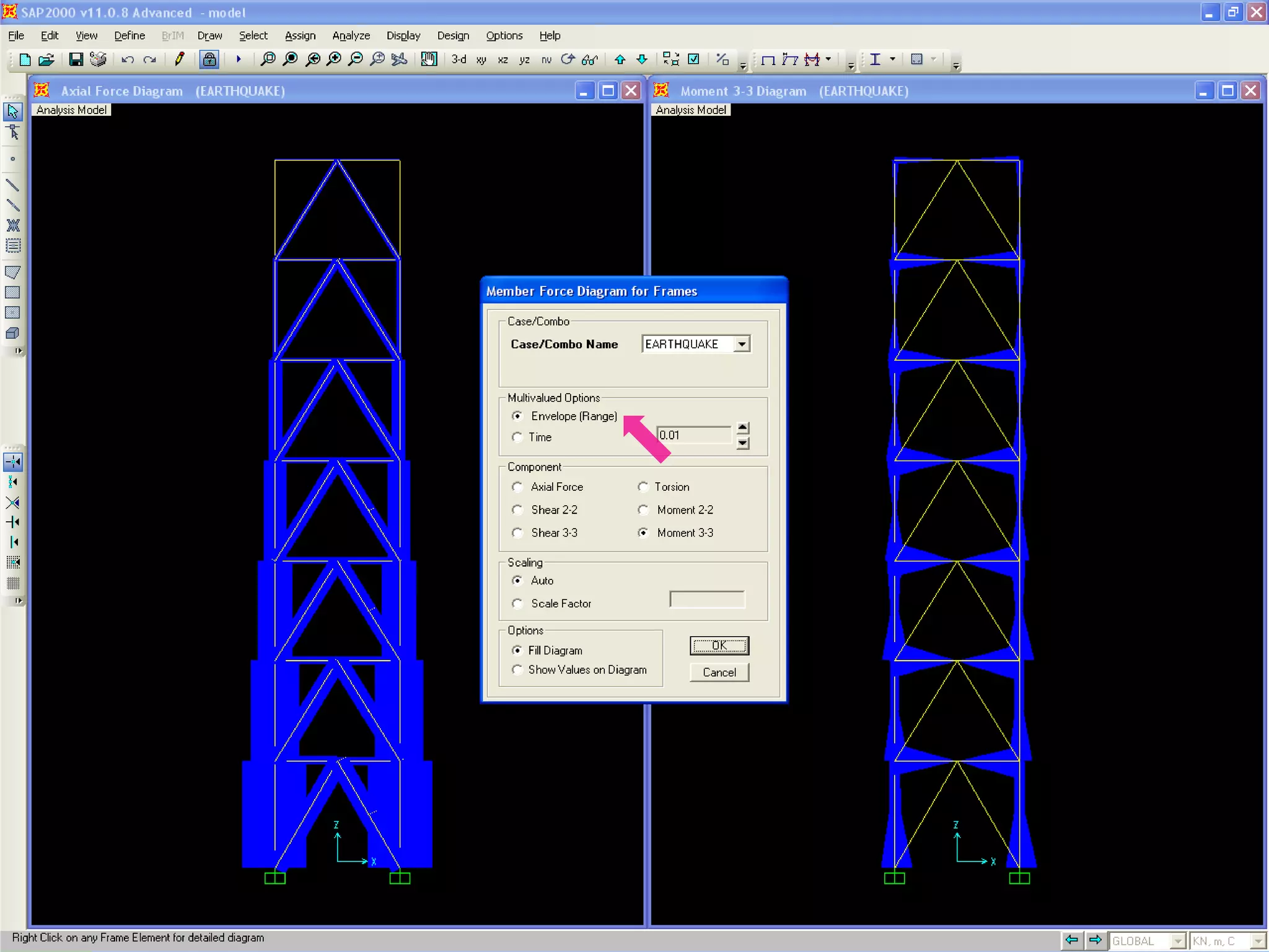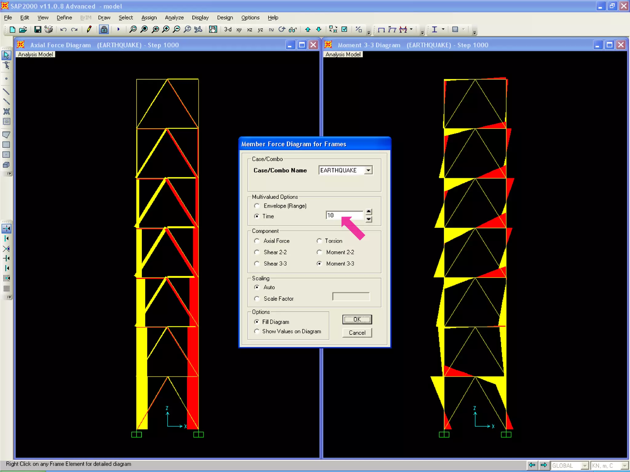 4) View and analyze results like envelopes of axial forces, moments, and time histories of displacements.