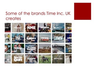 Time Inc. is an American publishing company known for magazines like Time, Sports Illustrated, and Fortune. It owns Time Inc. UK, which publishes UK magazines such as What's On TV, NME, Marie Claire, and Wallpaper. Time Inc. UK created the iconic music magazine NME, which has been instrumental in launching careers of bands like Arctic Monkeys and The Killers. NME also hosts live music events annually attended by over 200,000 fans.