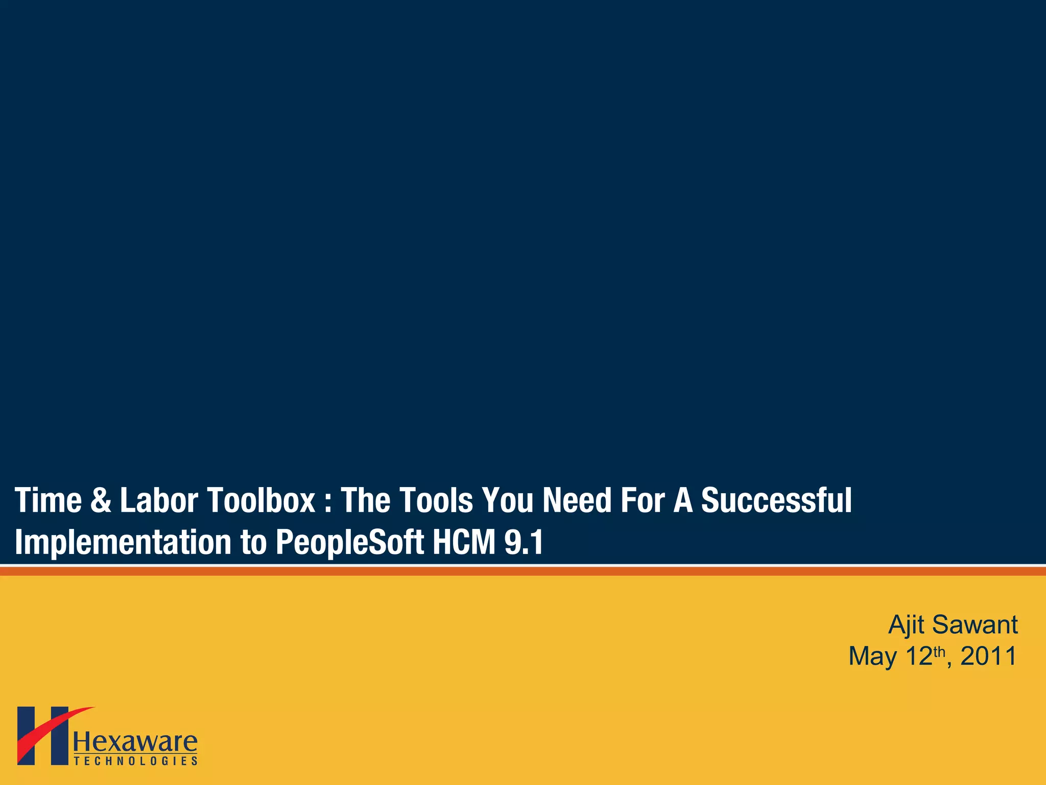 The document discusses implementing PeopleSoft HCM 9.1's time and labor toolbox. It provides an agenda that includes an introduction, overview of time and labor, key time and labor processes, benefits of version 9.1, implementation considerations, and Q&A. Time and labor allows tracking of employee and non-employee time and configuring pay policies for overtime, holidays, and absences. PeopleSoft 9.1 redesigned time and labor for improved usability compared to earlier versions.