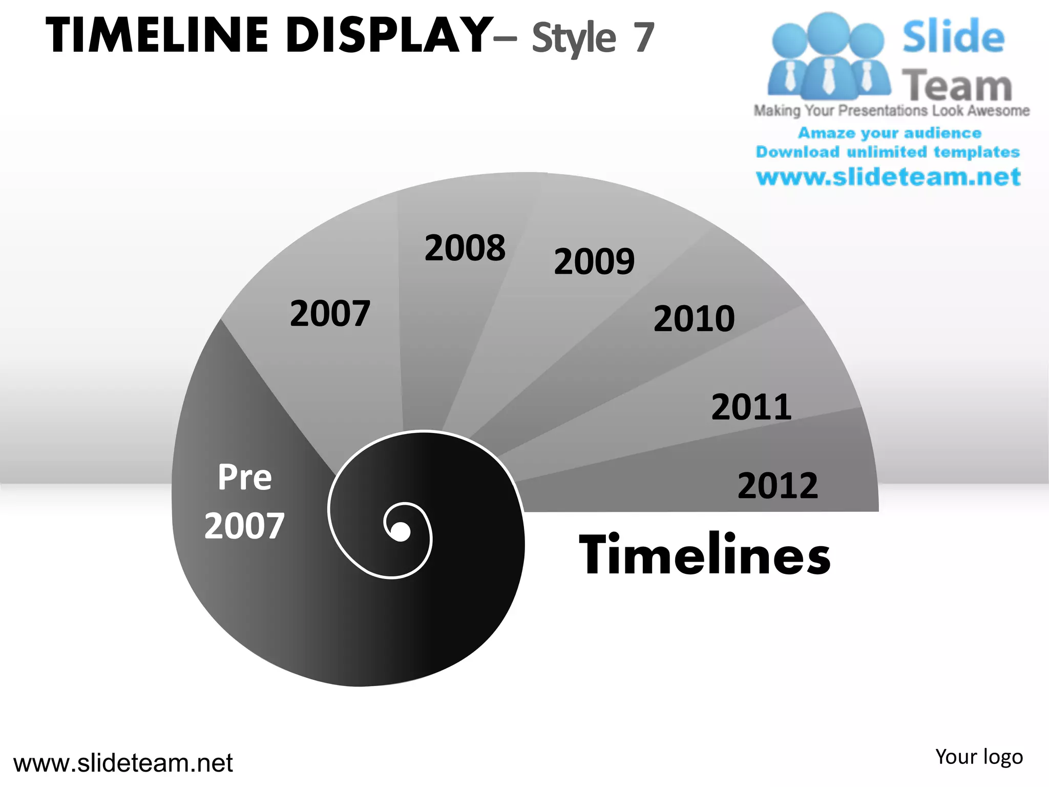 The document displays a timeline style with years ranging from 2007 to 2012 arranged horizontally. Events are displayed as icons above the corresponding years. The timeline can be customized in PowerPoint by changing the color, size, and orientation of icons and is fully editable. Individual objects can be ungrouped and modified separately by right clicking and using the ungroup and format shape options.