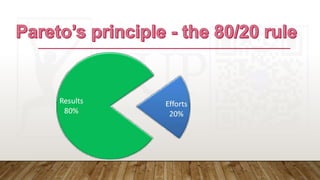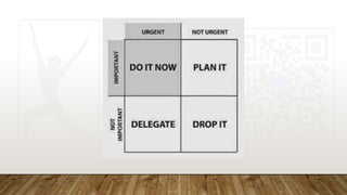 This document discusses strategies for managing time effectively and reducing stress. It recommends identifying tasks that can be deleted, delayed, or delegated to focus on priorities. It also suggests avoiding interruptions and unnecessary engagement on social media or in meetings. Procrastination, inability to delegate, and lack of clear objectives and priorities are identified as common problems. The document emphasizes the importance of planning work according to priorities and analyzing time usage, as well as maintaining a to-do list and learning to say "no". It also notes the value of leaving room in schedules for unexpected issues.