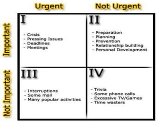 This document discusses various aspects of time management. It begins by listing common excuses people make for not managing their time well. It then discusses the value of time and how time is a limited resource. Several examples are given of how the lack of proper time management can cost money. The document emphasizes that successful people manage their time well. It discusses analyzing current time usage, prioritizing tasks, avoiding time wasters, and developing strategies and plans to better invest one's time. Overall, the key message is that effective time management is important for achieving goals and reducing stress.
