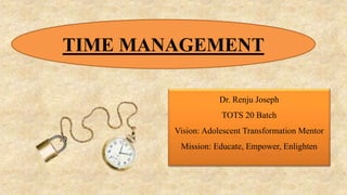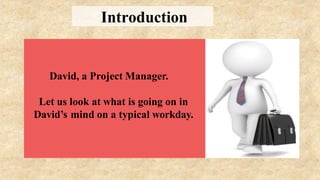 David, a project manager, is constantly late, overwhelmed with emails and tasks, and unable to balance his professional and personal responsibilities effectively. This is because he lacks proper time management. Some of his problems include being late to work and meetings, not having his project files or presentation ready, having to skip lunch to complete tasks, and likely being late to a family event in the evening. The root cause of all of David's issues is poor time management, as he suffers both professionally and personally due to not planning his day effectively. The document outlines various time management strategies like setting goals, developing a schedule, and revising plans, as well as common pitfalls to avoid like lack of planning and prioritizing.