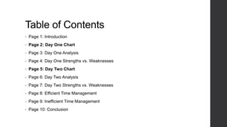 The document tracks the author's time management over two days using four quadrants to categorize tasks by importance and urgency. On day one, the author spent time preparing for exams, recreational activities, and was distracted. On day two, the author continued studying and completed errands but was distracted more. The author followed some effective time management rules unintentionally but could improve by dividing projects and reducing procrastination. Overall, the author realized the need to minimize unimportant tasks and complete important work earlier.