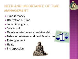 The document discusses time management and provides tips for effectively utilizing time. It recommends prioritizing responsibilities, creating a time table, and monitoring and modifying schedules. When allocating time, one should do, delegate, delay, or delete tasks. Goals should be specific, measurable, achievable, realistic, and time-based. Effective time management requires overcoming challenges like lack of motivation, stress, and unclear goals. Proper planning of meetings through agendas and time allocation can also help maximize productivity. Overall, the document emphasizes nurturing present time as an investment for the future.