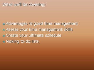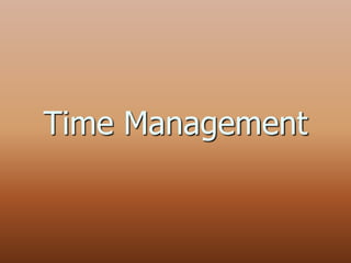 The document discusses the importance and techniques of effective time management, highlighting advantages such as increased productivity and reduced stress. It provides practical tips on monitoring time, creating to-do lists, using planners, and scheduling activities efficiently. It also addresses procrastination and offers strategies for overcoming it to enhance time management skills.