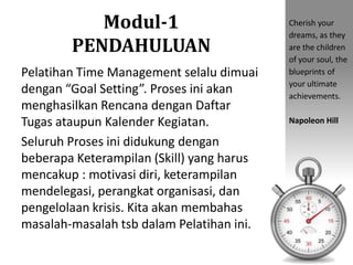 Dokumen tersebut merupakan modul pelatihan time management yang membahas berbagai teknik untuk mengelola waktu dengan lebih efisien, seperti menetapkan tujuan yang spesifik, memprioritaskan tugas, mendelegasikan pekerjaan, dan menciptakan ritual rutin.