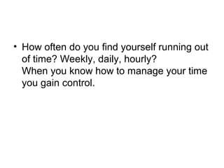 This document provides information and tips on effective time management. It discusses setting goals using the SMART framework, keeping activity logs to understand how time is spent, managing interruptions, overcoming procrastination, creating action plans, and effective scheduling. The key points are to set specific, measurable, attainable, relevant and time-bound goals; understand current time usage; prioritize important over urgent tasks; break large goals into action steps; and schedule time proactively to achieve priorities and goals. Regular review and adjustment of schedules is recommended to manage time effectively.