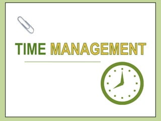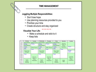 This document discusses various time management strategies and techniques. It addresses juggling multiple responsibilities, prioritizing tasks, creating schedules, breaking large tasks into smaller parts, managing procrastination, effectively using study time, balancing extracurricular activities, finding motivation, scheduling, using to-do lists, and managing stress. The overall message is that planning, organization, prioritization, and maintaining a balanced lifestyle are key aspects of effective time management.