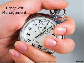This document defines time management and provides tips for effective time management. It begins by defining time management as consciously controlling the time spent on activities. It then lists reasons for time management like saving time, reducing stress, and increasing productivity. The document outlines the time management process of making activity logs, setting goals and priorities, planning, scheduling, and tracking progress. Specific tips are provided like focusing on most productive times, taking breaks, reassessing schedules, and getting enough sleep. Overall it provides a comprehensive overview of defining and implementing effective time management strategies.