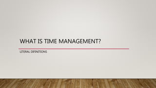 This document discusses time management and provides tips for effective time management. It defines time management as managing time effectively by allocating the right time to the right activities. It notes that time management allows for increased work output and better control over one's life by reducing stress. The basics of time management include costing your time, setting goals and priorities, planning activities, and scheduling tasks to achieve goals in an efficient manner. Mastering these time management techniques can help one manage themselves, their work, and others.