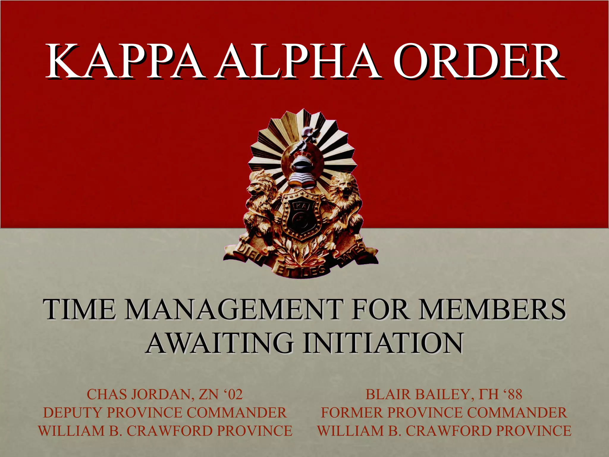 This document provides time management tips for members of Kappa Alpha Order awaiting initiation. It outlines four priorities: [1] school and maintaining grades; [2] work; [3] commitments to KA; and [4] everything else like partying. It stresses creating a plan around these priorities, including setting objectives for studying at optimal times. Members are encouraged to plan social events and downtime. Study skills like identifying the best study times and finding a good study place are also mentioned. Resources from KA are listed to help with academics and any other issues.