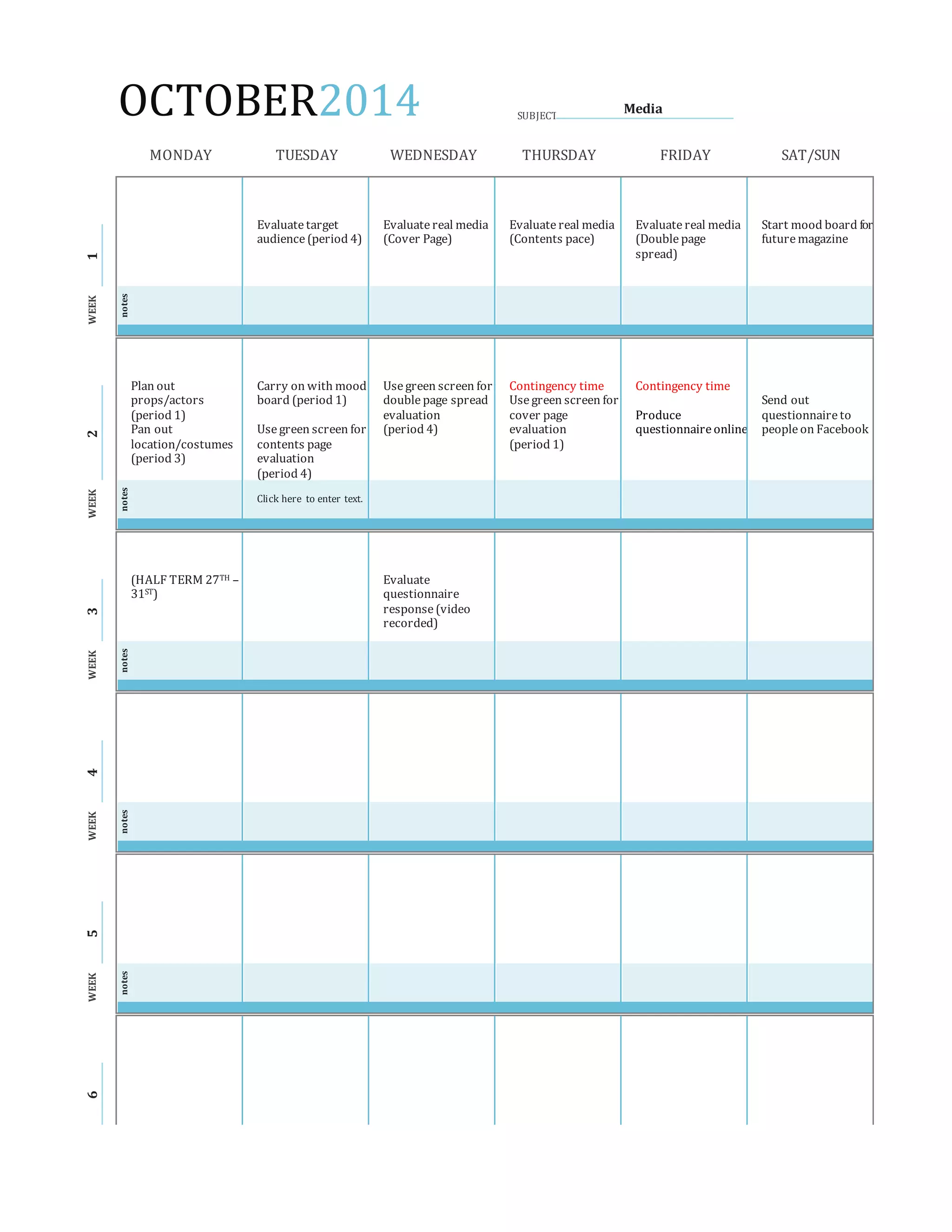 This document outlines a media project schedule for several weeks. It includes evaluating target audiences and real media like magazine covers and spreads. It also involves planning props, actors, locations and costumes. Time is allotted for creating mood boards and using green screens to evaluate magazine elements. A questionnaire will be produced and distributed to gather feedback, which will then be evaluated the following week.