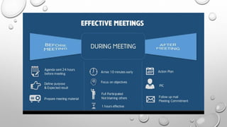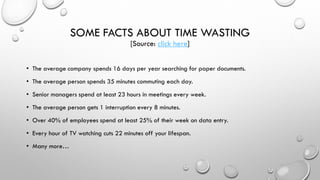 This document provides information on effective time management. It discusses how people waste time and gives statistics on common time-wasting activities. It then discusses what time management is and gives strategies for improving time management, including determining values and goals, prioritizing tasks, planning work, avoiding distractions, and overcoming procrastination. The document emphasizes setting clear priorities, delegating tasks, focusing on the most important tasks, avoiding multitasking, and creating blocks of uninterrupted time to maximize productivity.