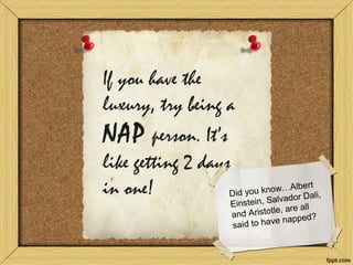 The document provides tips for improving productivity, including maintaining a single calendar, scheduling exercise and work tasks, taking naps, creating a to-do list the night before, building a personal learning network, outsourcing tasks, minimizing distractions, accepting that perfectionism slows completion, and having backup activities like reading. It also notes the importance of knowing one's biorhythms, goals, and the value of time.