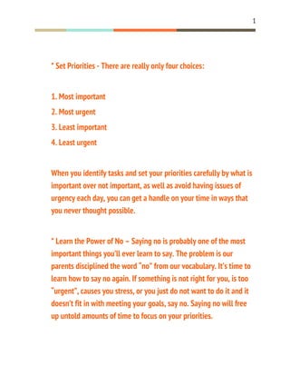 The document offers time management tips to enhance productivity, emphasizing the importance of setting priorities, learning to say no, and disconnecting from technology. Key strategies include scheduling tasks, ignoring distractions, outsourcing when possible, and minimizing multitasking. Regularly checking and updating your schedule can help maintain focus and ensure tasks align with your goals.