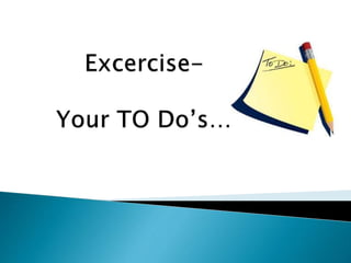 Time management refers to allocating the right amount of time to the right activities in order to save time, reduce stress, work more effectively, and have more control over responsibilities. Effective time management techniques include making to-do lists, setting goals and objectives, planning activities, prioritizing tasks, and delegating responsibilities. The time management matrix provides a framework for determining whether tasks should be done immediately, scheduled, delegated, or removed from the to-do list in order to improve focus, meet deadlines, maintain energy levels, and ensure high quality work.