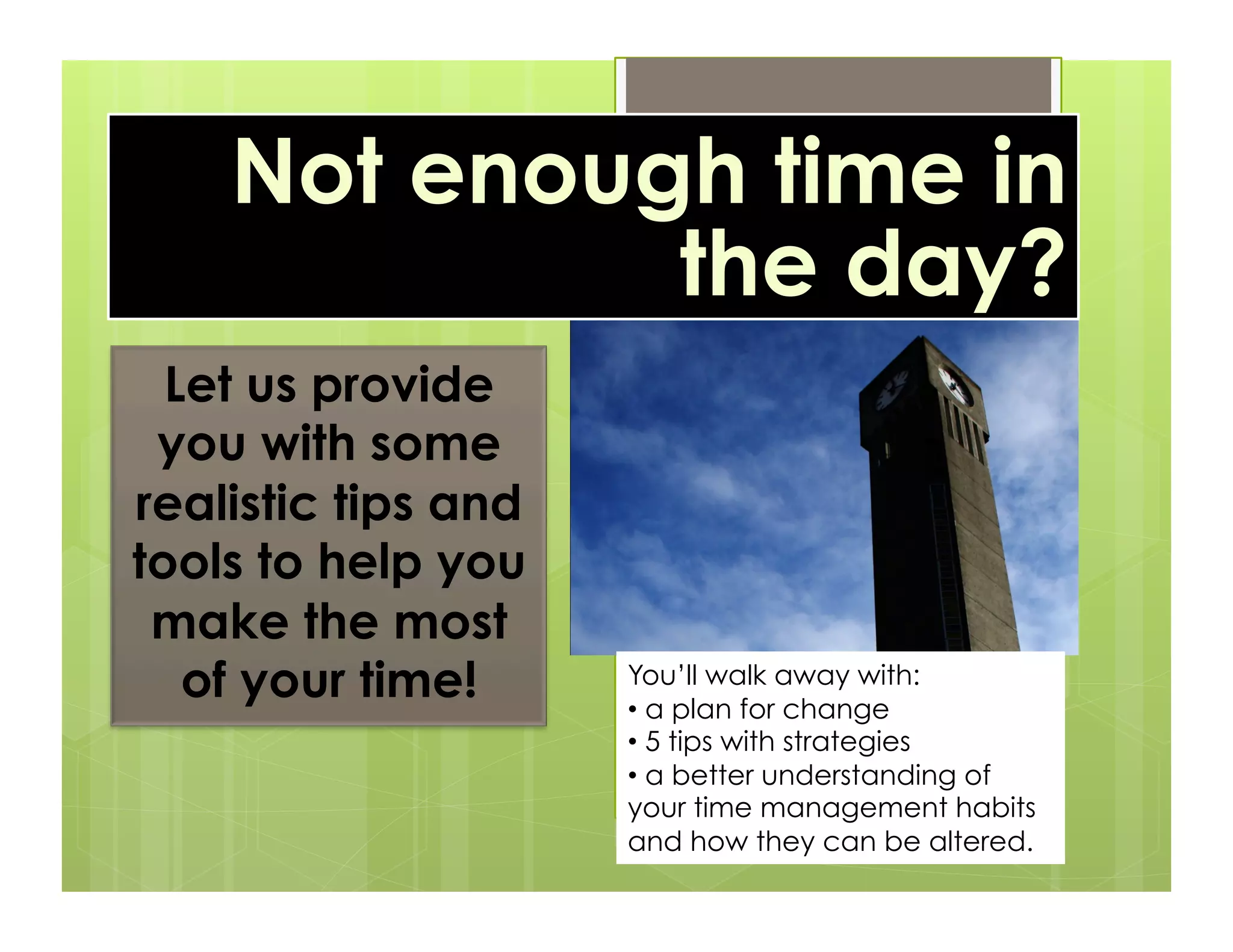The document provides 5 tips for improving time management as a university student, including visualizing success, dealing with procrastination by limiting distractions, getting organized by writing things down and using a calendar, studying smarter by reading in short bursts between classes, and maintaining a social life. It encourages students to be realistic in their time management goals and provides additional resources for students struggling with their schedules.