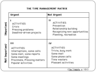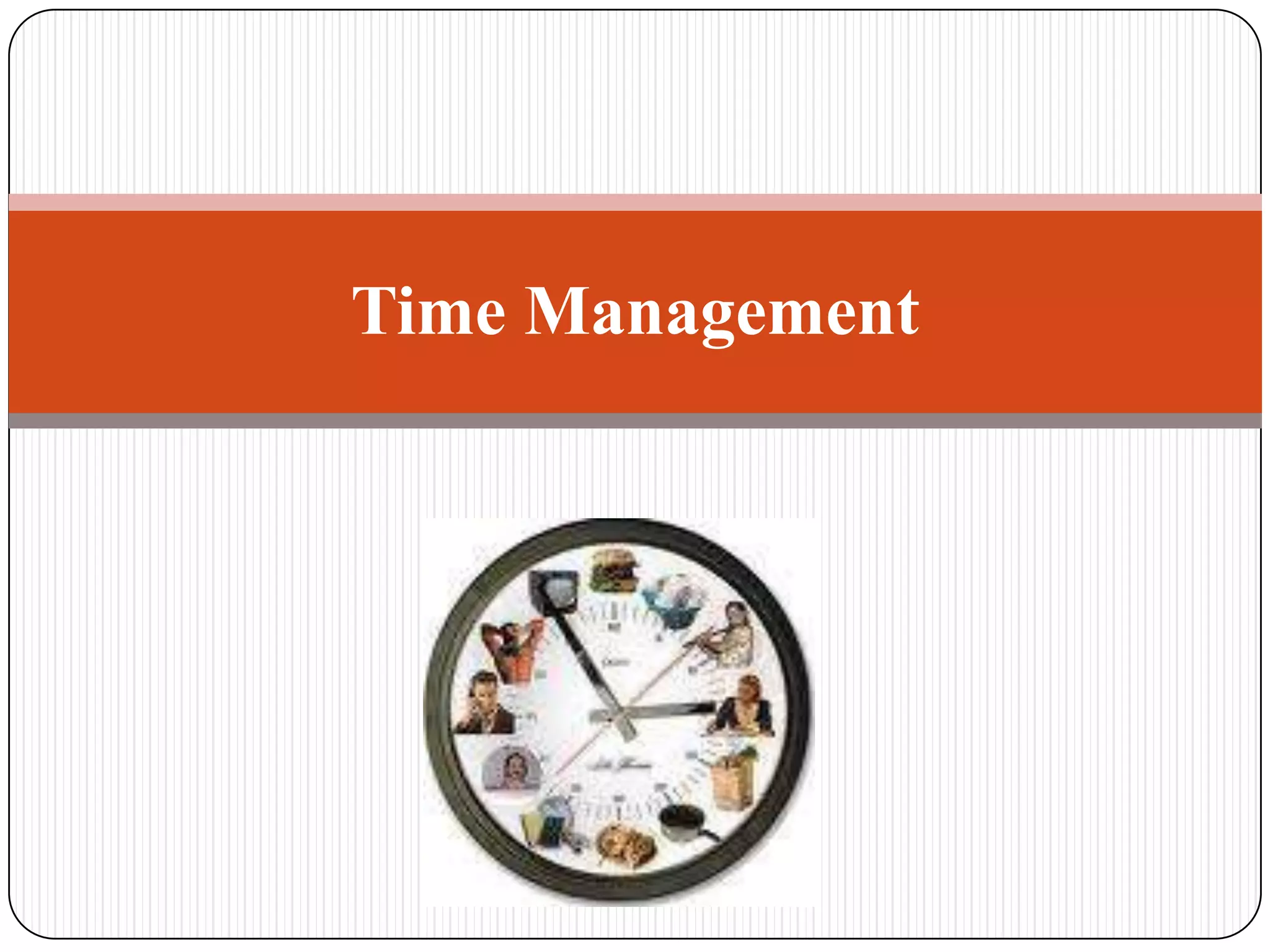 This document discusses time management techniques. It begins by defining time management as planning, allocating, setting goals, and organizing one's time. It then discusses common time wasters like interruptions, conflicts, personal issues during work hours, procrastination, and lack of self-discipline. The document provides tips for improving time management, such as prioritizing tasks, minimizing distractions, avoiding procrastination, and scheduling one's time. It emphasizes the importance of being disciplined with one's use of time in order to be productive.