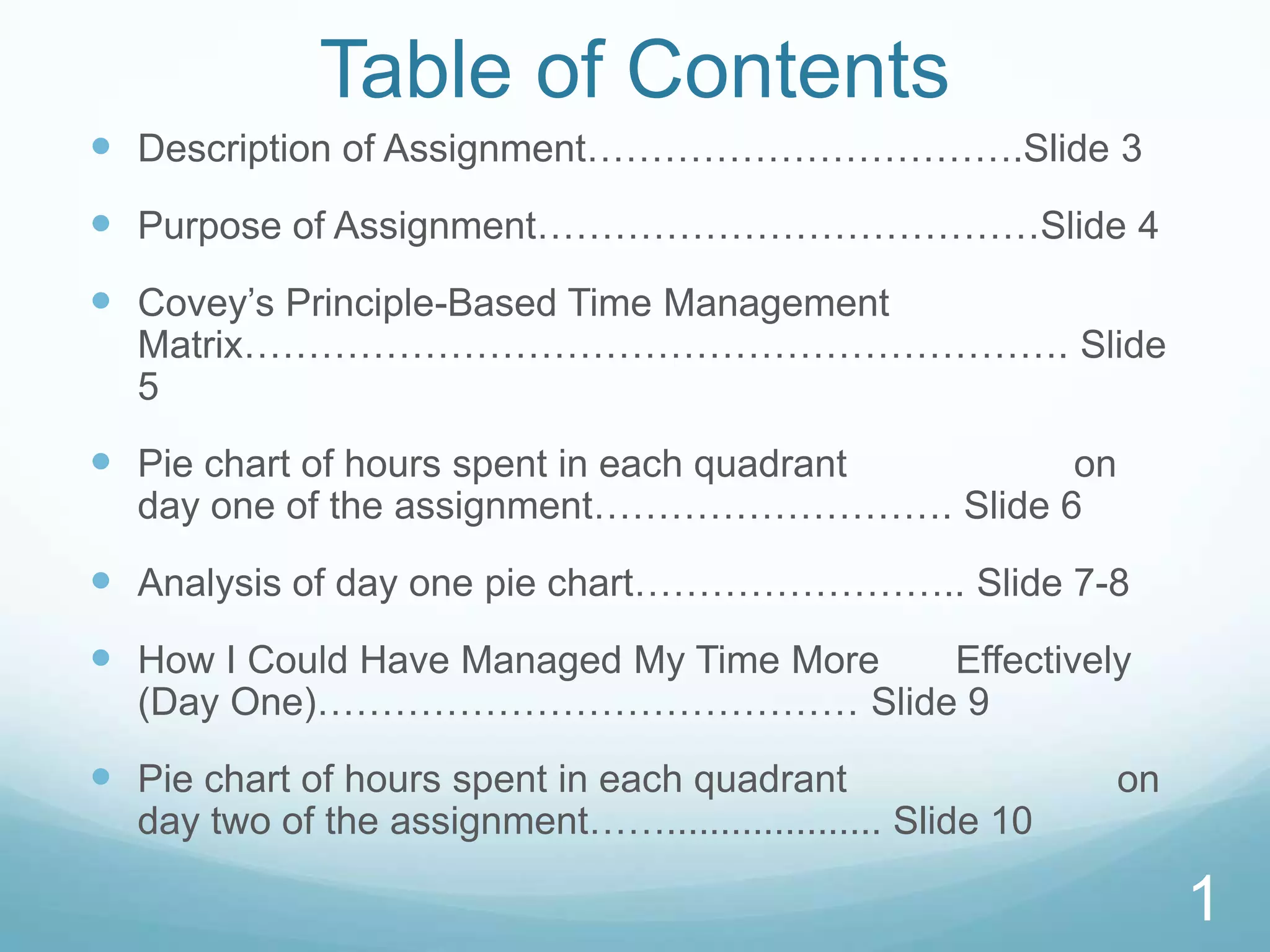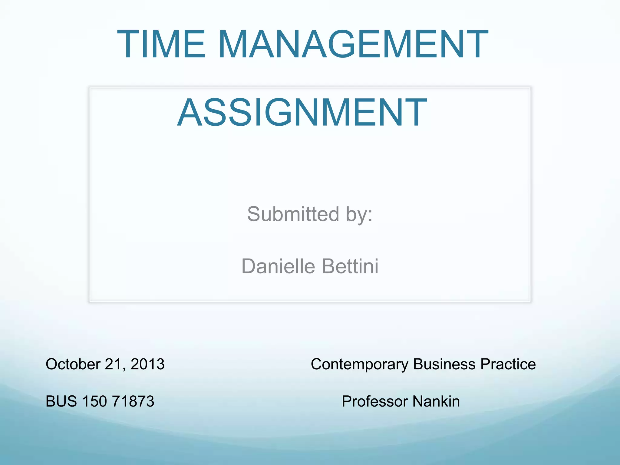 This document is a time management assignment submitted by Danielle Bettini analyzing how she spent her time over two days using Covey's time management matrix. On day one, 81% of her time was spent in quadrant II (important/not urgent activities), while on day two it was 40%. Cumulatively, 51% of her 22.5 hours were in quadrant II. While she did well spending time in quadrant II, she recognizes weaknesses in prioritizing tasks, avoiding procrastination, and being more productive during waiting periods. The assignment concludes she needs to spend less time in quadrants III and IV and do quadrant I activities first as recommended by Covey's model.