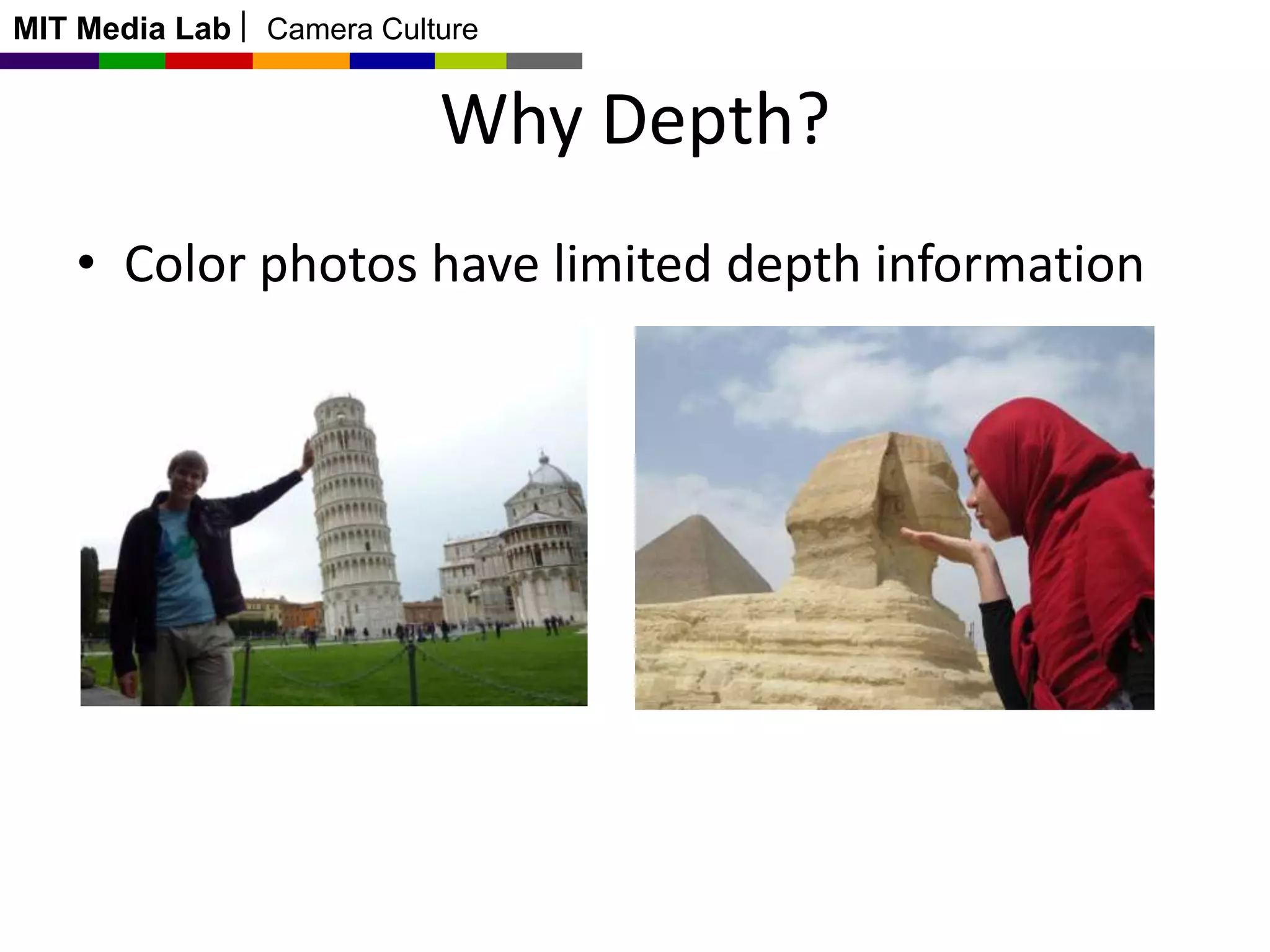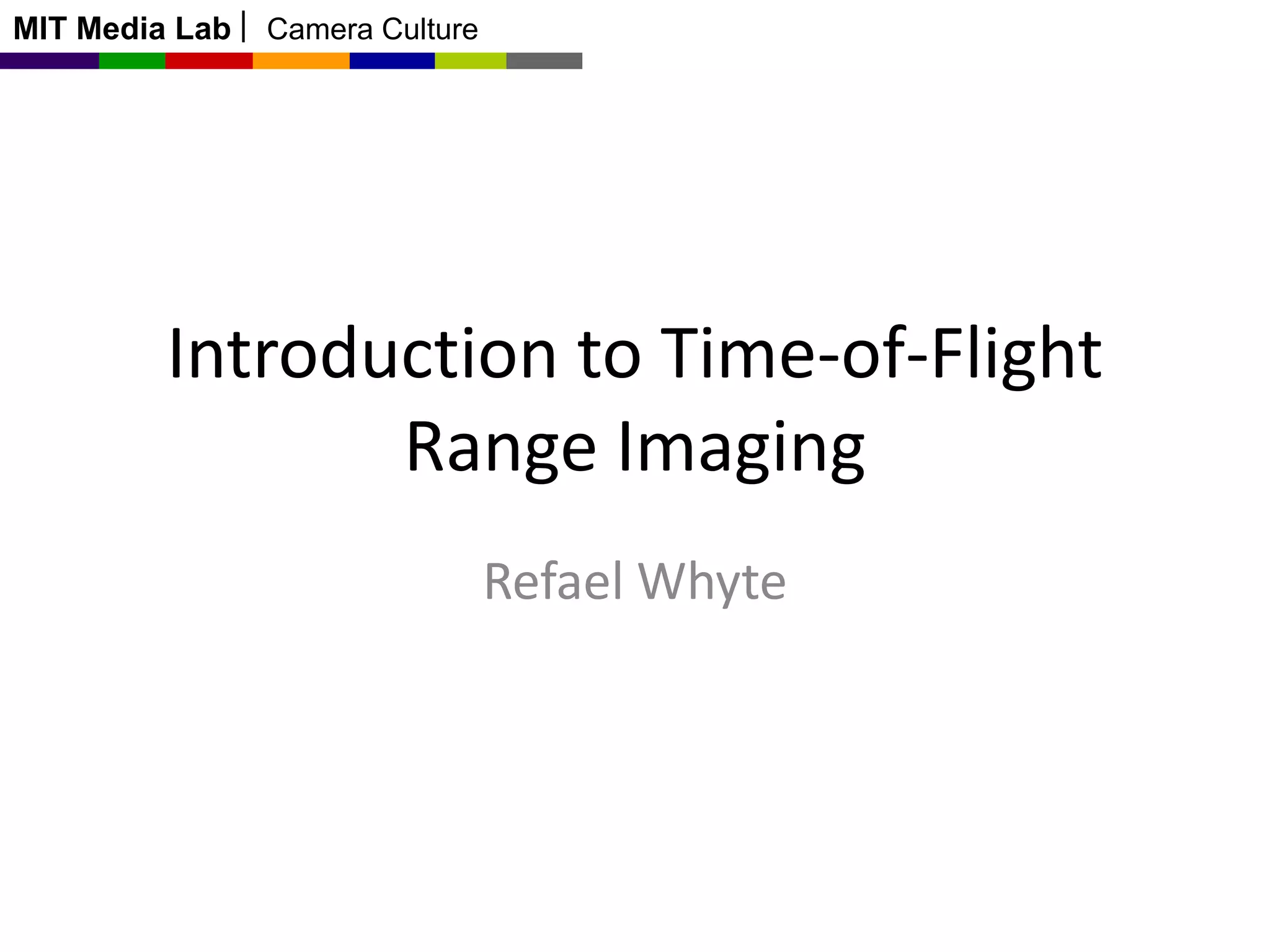 This document discusses time-of-flight cameras and range imaging. It explains that time-of-flight cameras work by illuminating a scene with amplitude modulated light and measuring the phase difference between the transmitted and reflected light, which encodes distance information. It describes the correlation process used to measure distance at each pixel and discusses sources of error such as multipath interference and temperature drift. Real data examples from a 120x160 sensor are shown. Applications discussed include uses in the Kinect, 3D scanning, and potential future uses in mobile phones.