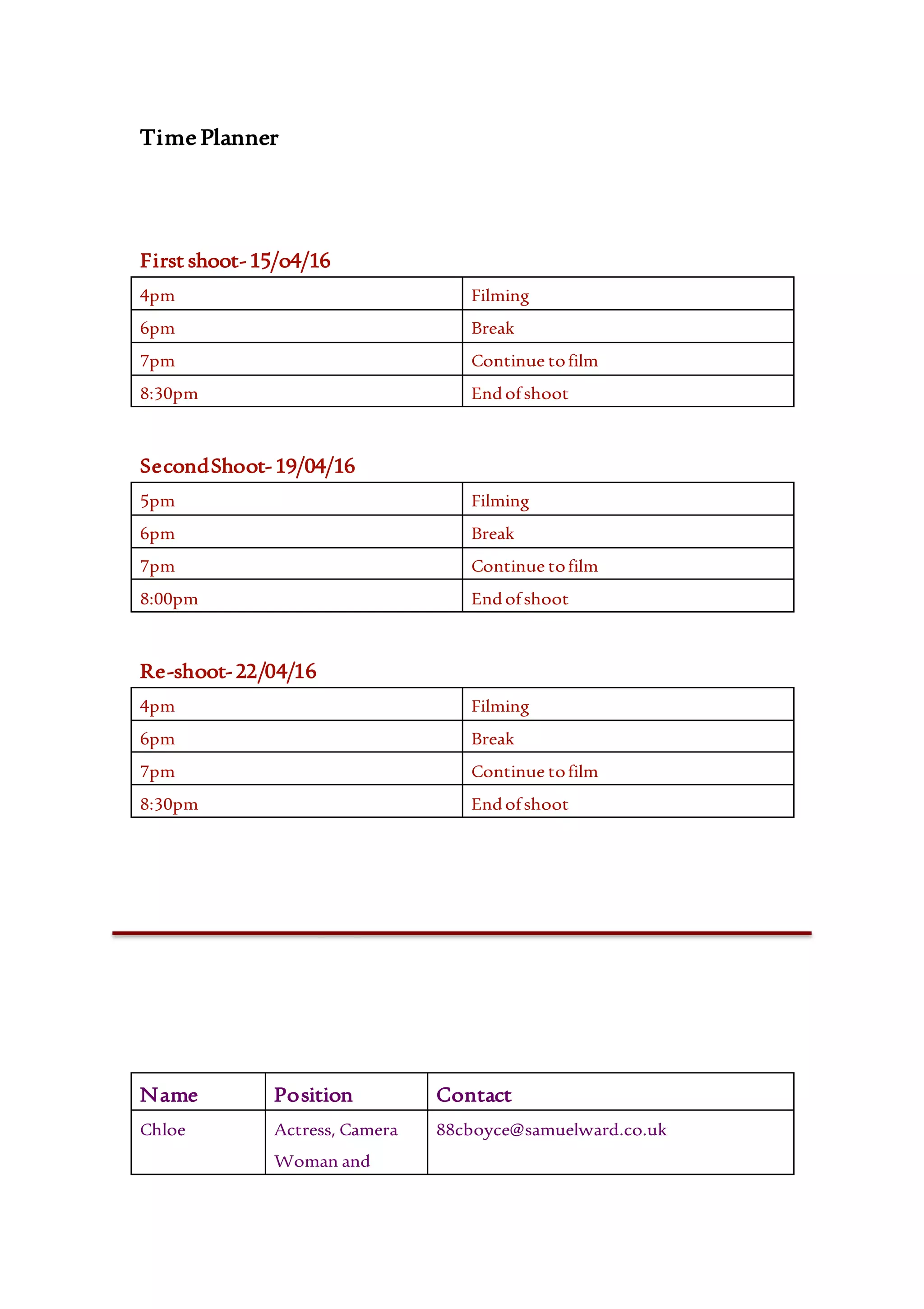This document outlines the schedule and logistics for three film shoots. The first shoot takes place on April 15th from 4-8:30pm. The second shoot is on April 19th from 5-8pm. A re-shoot is scheduled for April 22nd from 4-8:30pm. The document details the roles of three actresses, hazards and risks associated with the shoots, and transportation plans for crew members to arrive at the filming location.
